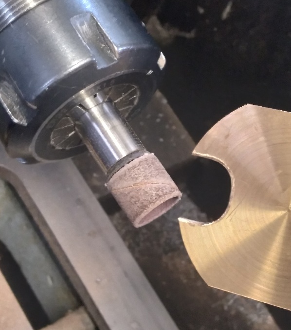 Next, use a sanding drum to abrade the bevel into an arc. It is good to have the oversize blank to hold onto while sanding.