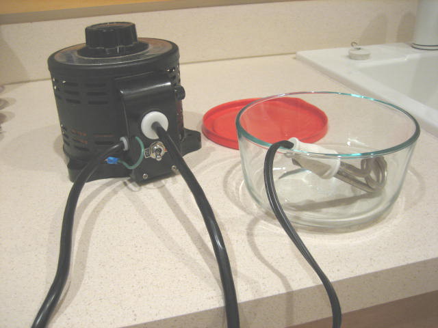 I heat the sealing solution with an immersion heater designed for coffee cups. It has more than adequate power, so once boiling starts I reduce the power with the variac so the solution does not boil away.