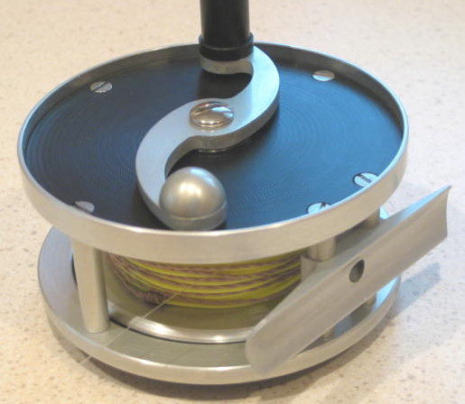 My first reel design required several aluminum parts, and to protect these I wanted to anodize. But anodizing requires a hazardous (though readily available) chemical, sulfuric acid. To dispose of old acid, you must first neutralize it with baking soda. It makes sense to use a minimum amount. I have developed fixtures that allow me to anodize each aluminum reel part using only 8 oz of diluted acid (4 oz battery acid from an auto parts store, plus 4 oz distilled water). Here is a picture of the reel after anodizing the aluminum parts. The aluminum is less reflective after the treatment than it was before, and so is a better thing to carry on a trout stream.