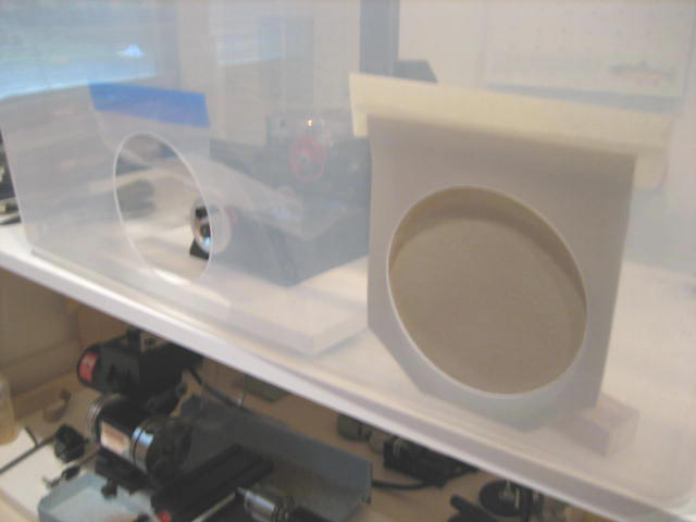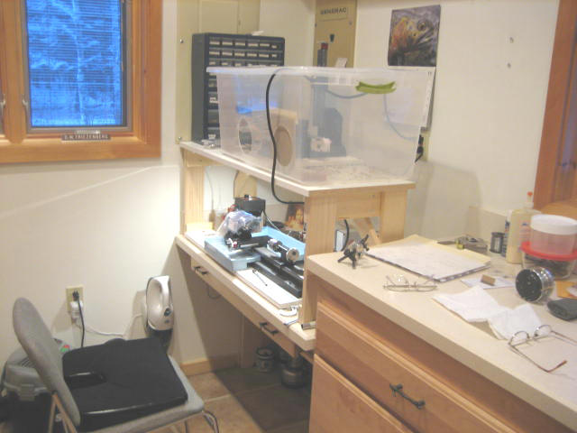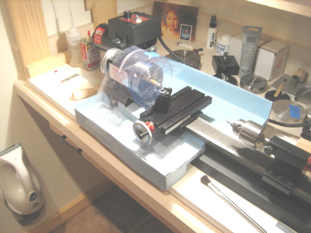 This is my “machine shop”, a corner of our utility room. The lathe is on the desk below and the mill sits above it, inside a tote that captures most of the flying chips.