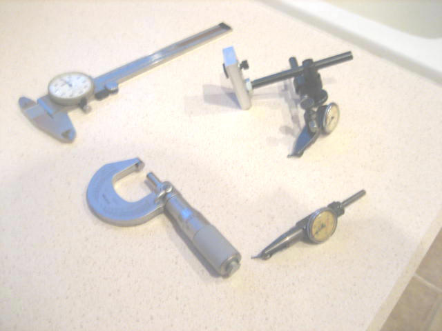 Some measuring tools: micrometer, dial caliper, and two Starrett “Last Word” indicators (Ebay purchases).