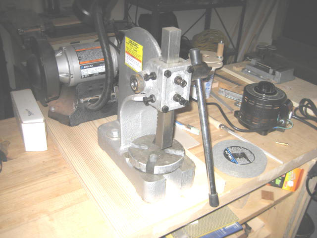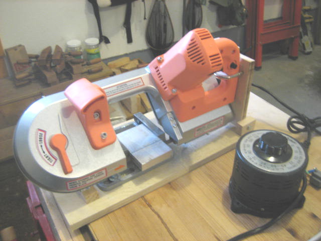 Raw materials are typically available in one foot lengths. A power bandsaw is a convenience. I made this one from a Harbor Freight handheld saw. I use the variac to reduce its speed, as the trigger control seems ineffective.