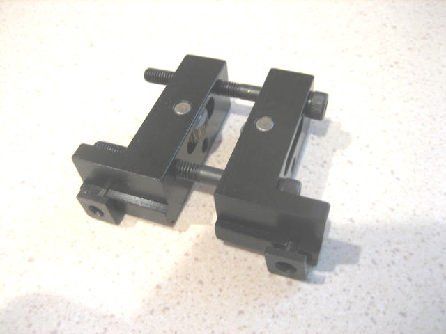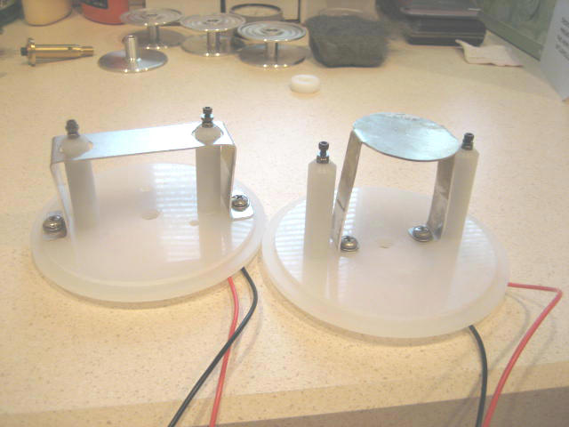 Here are the working ends of anodizing fixtures for the rings and crank. The parts to be anodized are secured to titanium electrodes by titanium screws. Cathodes are made from sheet aluminum.