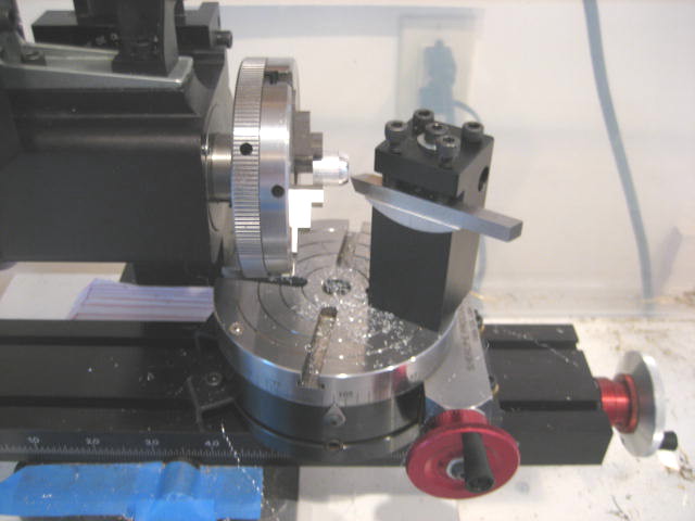 Here I am turning the spherical surface of the crank counterweight, with a lathe toolpost mounted on the rotary table. The part is held on the mill, not the lathe.