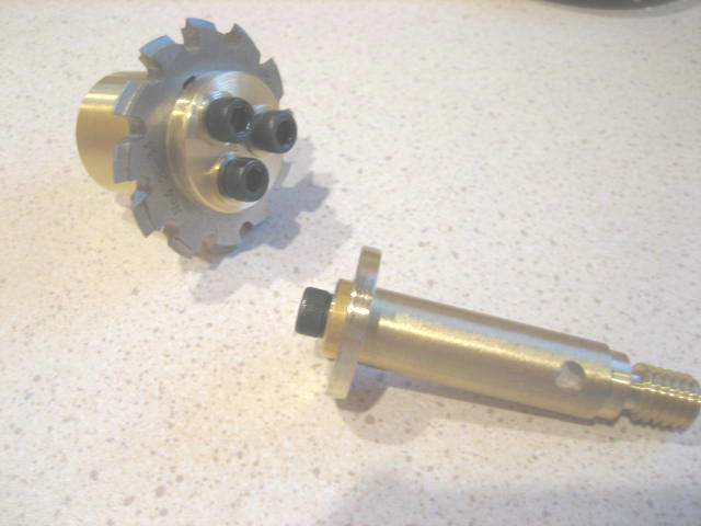 For ratchet notching, I am replacing the V-groove milling cutter with a more rigid gear cutter. Also shown is a ratchet blank on a mandrel.