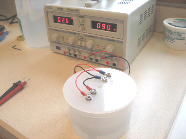 This shot was taken while anodizing an aluminum part. The process requires battery acid and a current-controlled power supply.