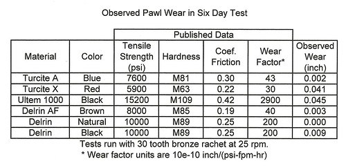 If anyone would like to compare another material, please provide me with a material sample (a disc 0.125 thick and 0.75 diameter would work) and I will make the pawl and run under the same conditions.