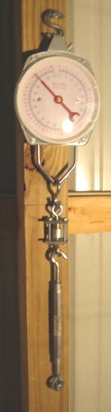 Here is my pull test setup, on a post in my pole barn. I bought a 110 pound (50 Kg) spring scale on Ebay and used a large turnbuckle to apply the load. I put a small frame of drilled bars and bolts around the test article so parts would not go flying if the joint broke. All 3 test assemblies held at 100 pounds.