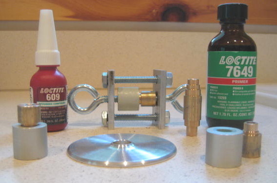 Before committing real parts to the process, I made 3 sets of cylindrical test parts. These have the same mating surface diameter (7/16) and axial engagement (0.180) as the reel spool parts. They also have tapped holes so that eye bolts can be attached. Diametral clearance is 0.001 to 0.002, and the aluminum is anodized as described in a May 4, 2010 entry of this blog. I used the primer only on the aluminum part. After 3 days of cure, I was ready to test the joints for strength. If the joints would hold 50 pounds or so, I would consider them adequate.