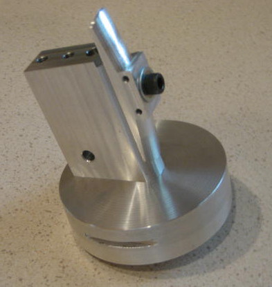 To quickly position the stock, I have made a small fixture that pilots onto the center of the rotary table and onto a tooling hole in the center of the part. The stock fits down into a groove that ensures centering over the rotary table.