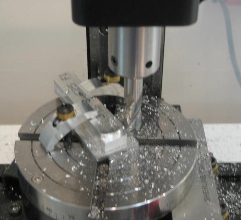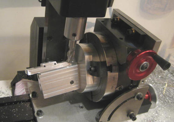 Next I cut the convex radius on the top. The standard is not definite on this surface, is it cylindrical or conical? If conical, it could be cut on a lathe by bolting the stock to a mandrel. But I decided to make it cylindrical, so I do it with the rotary table, using a fixture that sets the required 7.5 degree angle.