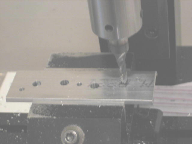 The initial step was to drill location holes for handle, shaft and counterweight. These are 0.116 inch diameter, a close fit for a 4-40 UNC screw. The drilled blank is then fastened into tapped holes in the tool plate with 4-40 socket head cap screws. I used brass washers as spacers to raise the blank off the face of the tool plate, but this is not really necessary. The tool plate is 3 inch diameter and 3/4 thick.