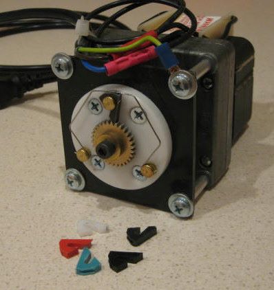 After discovering a possible misoperation of my first pawl test fixture, I built a new tester using a real gearmotor. This gearmotor has a shaded pole ac motor and a 3 stage geared reducer; one stage helical and two stages straight tooth.