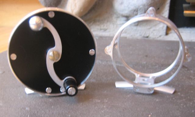 Here is the the raised pillar frame, compared to a round reel that uses the same spool. I will make black Delrin side plates to press into the rings.