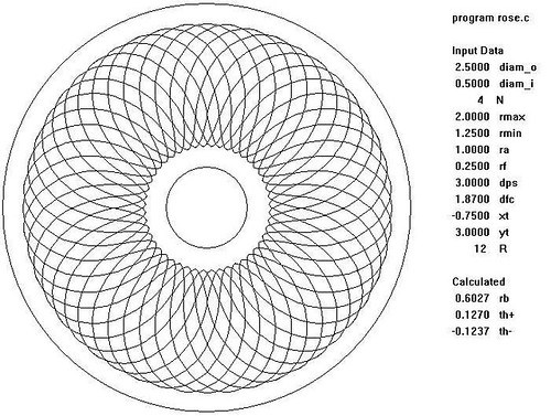 To engrave a 2.5 inch diameter sideplate, how big would the engine have to be? To answer this, I have coded (Visual C) a “virtual rose engine”. Here is what I can get with an engine that is only 3 inches from headstock pivot to spindle, with a rose cam of 4 inches maximum diameter.