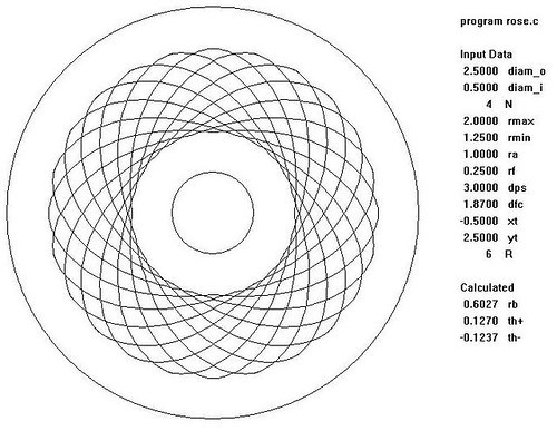 To engrave a 2.5 inch diameter sideplate, how big would the engine have to be? To answer this, I have coded (Visual C) a “virtual rose engine”. Here is what I can get with an engine that is only 3 inches from headstock pivot to spindle, with a rose cam of 4 inches maximum diameter.