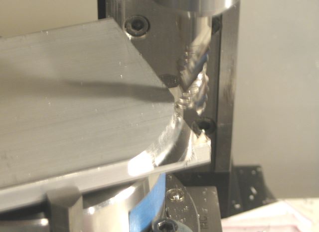This end mill was able to make groove cuts of .070 depth with little sign of load on the mill. I am sure that I could have made deeper cuts. Here it is rounding the corners of rectangular bar stock. Despite having 3 flutes, it did not chatter side-to-side when it got into the double sided area of the groove.