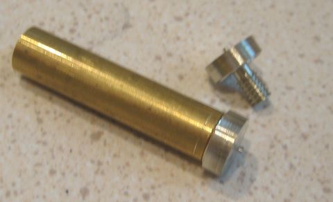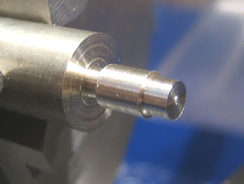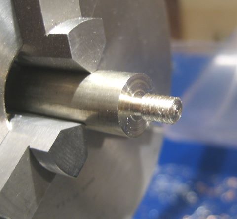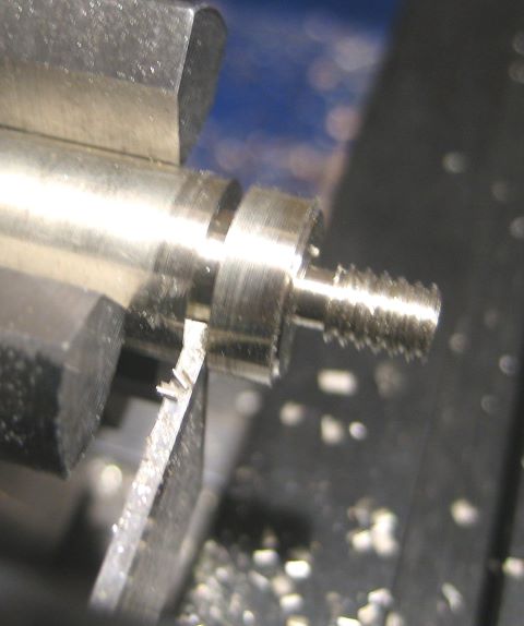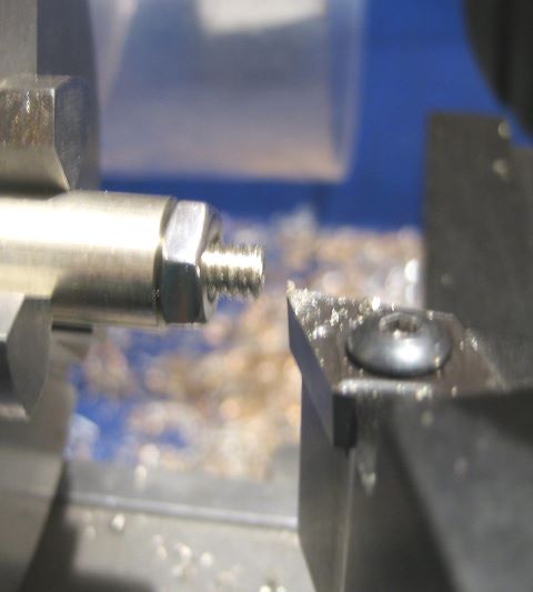 Small screws (this one is 8-32) are most quickly cut with a threading die. The problem is starting the die; it is likely to chew up the end of the screw before biting in and cutting. So my foolproof scheme is to make a blank longer than is needed, and then turn a small diameter at the end. Here is a screw blank properly prepared.