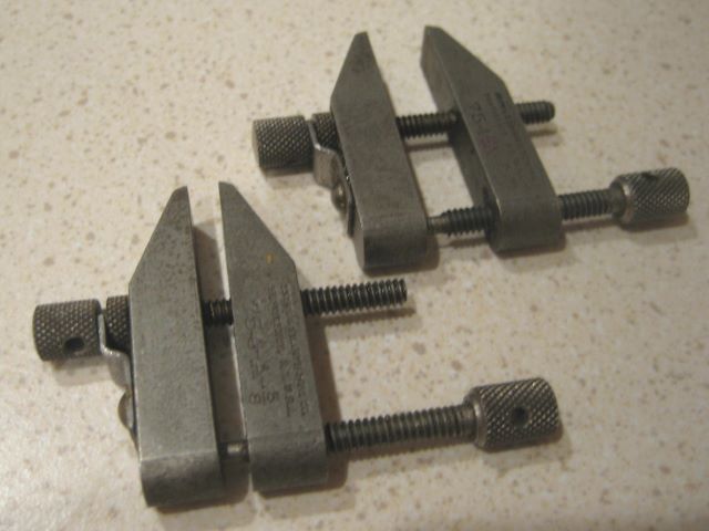 A friend gave me this pair of clamps. They were made by Brown & Sharpe, perhaps 1950s or so, and have the part number 754-A-5/8. I believe the 5/8 in the part number indicates 5/8 inch jaw depth.