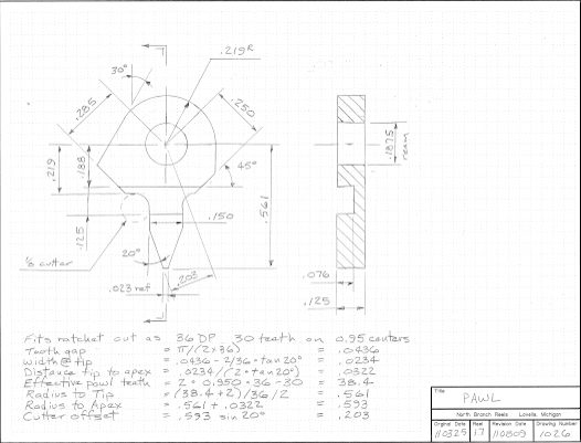 Change material from bronze to Delrin or Acetal Copolymer. I have switched involute cutters from #4 to #8 to get a rounder tooth, but this is not very important. This is a ratchet and not a gear so profile is not critical. Grinding your own “one tooth” cutter would be a reasonable approach. 10 May 2010.