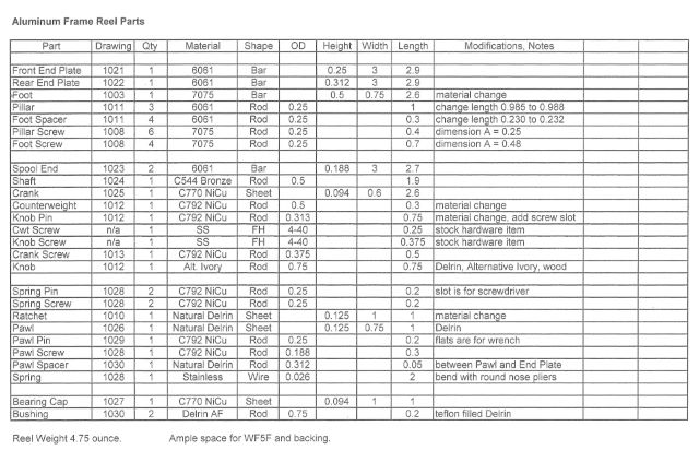 I have been machining parts for the Aluminum Frame Reel from a few finished drawings, but mostly from sketches on yellow lined paper. It is time to put together all the drawings, so next year I can still figure out what I did. Here is a reference table for the parts and drawings.