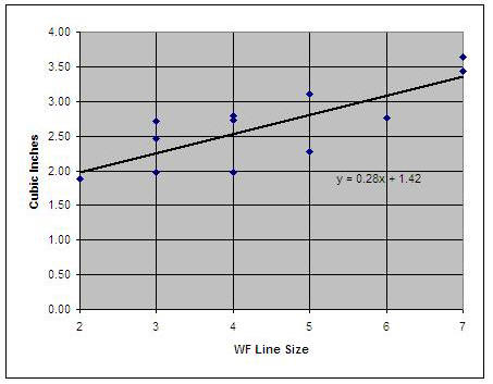 Is the trend line a good guideline for reel design? Consider the Pflueger Hawkeye that I showed on 3 Dec 2011. It has a 1.8 cubic inch spool and was wound with just a WF3F and no backing. I would say that the spool was somewhat more full than I would like to have it (i.e., danger of a jam against the pillars when winding on frantically). The 2.25 cubic inch space recommended by the trendline would be more comfortable.