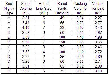 My purpose was to discover what volume is left on the reel spool after the rated yards of backing have been installed. This volume represents the volume needed for a neatly-wound-on fly line, plus the extra space that should be allowed when the line less neatly wound on. To know the volume occupied by the backing, I bought a 20 lb./100 yd spool of Scientific Anglers backing (3M P/N 34-8505-9217-0). By winding this onto a bare spool, I found that it occupied 1.10 cubic inches. This backing diameter is .010 inch, measured on the flat part of my dial caliper jaws.