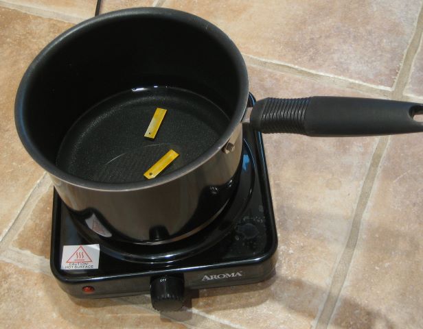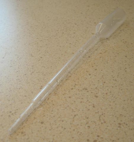 The dye solution is 8 ounces of distilled water and 1/8 ounce (3.7 ml) of dye concentrate. To measure the dye concentrate with some accuracy, I used a transfer pipette. It is graduated, and can pick up 1 ml at a time.