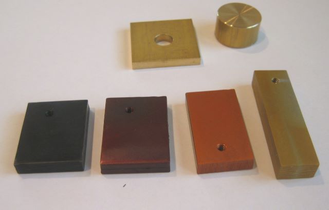 Across the bottom of this picture are 4 dyed samples: Black HBL, Bronze, Copper BF, and Gold S. These are from Caswell. Also in the picture for comparison are two scrap pieces of 360 brass.