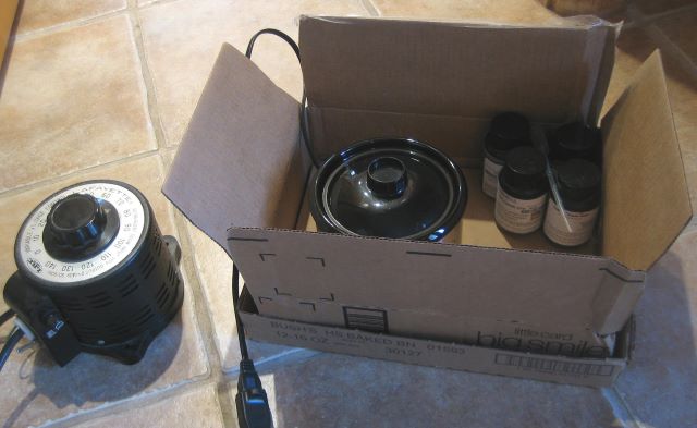 I did my dyeing of these small samples in a 16 ounce mini crockpot, using 8 ounces of diluted dye. This crockpot did not have a power control, so I ran it with a variac in order to maintain the solution at 140F.