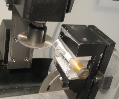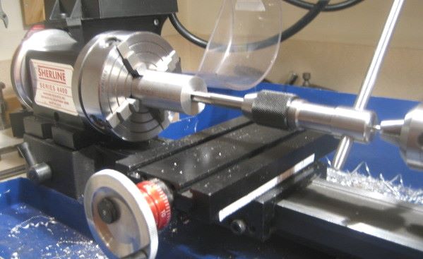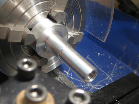 If I want to re-bore the chuck in the future for a different diameter, I can fit a pin in the center hole (0.250″) to keep the chuck from pulling in when it is tightened. Just to saw the three slots, I put a sacrificial aluminum pin in the center.