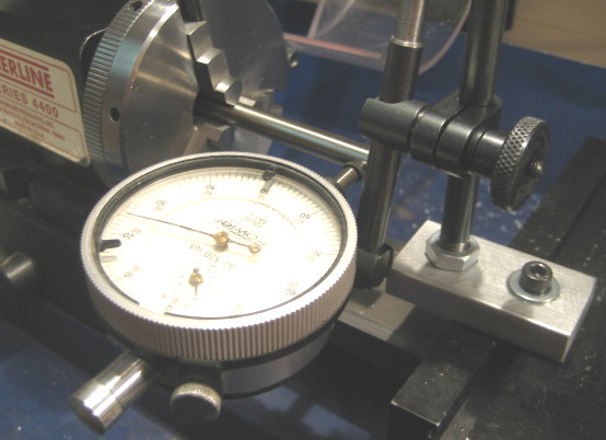 On a Sherline lathe, you can rotate the headstock when you want to cut a taper. Here I have chucked a straight rod in order to indicate the angle tangent.