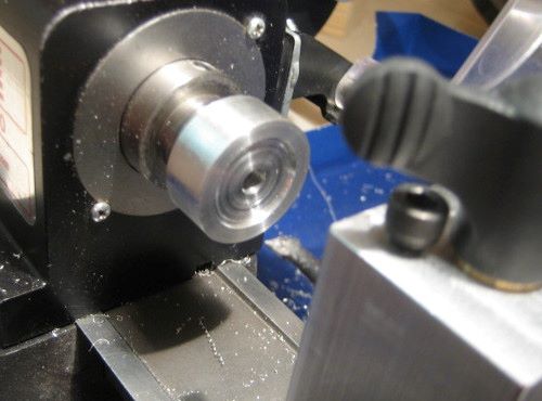 Update 29 May 2012: The aluminum pot chuck did not survive repeated pull-in on the spindle taper. After making 3 washers, it had worn to the point that it could no longer grip. Wear was at the large end of the taper, suggesting that my taper was a little too shallow. 2011 aluminum, at HRB 60, is just too soft for this type of tool. I will re-make the chuck from steel. 12L14 will give me HRB 84 and nearly as good machinability.