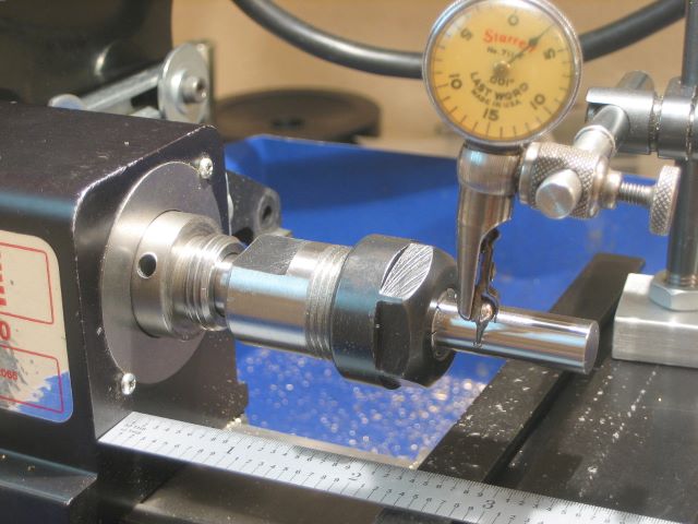 I clamped a 3/8 gauge pin and found the TIR to be just 0.0004 inch. The collets can swallow some stock; the gauge pin would go in 1.4 inches.