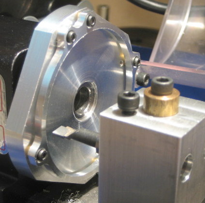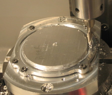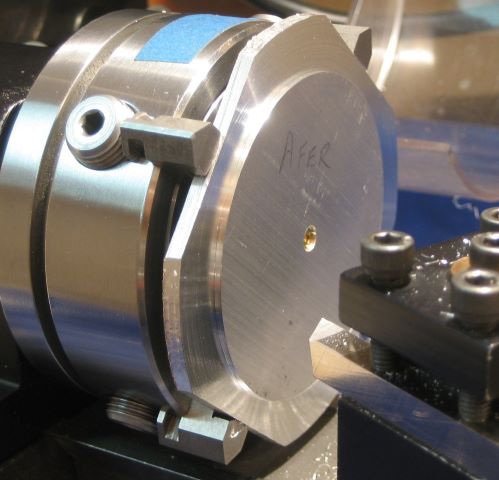 Starting with a square of bar stock, round the corners and flatten the back. Clamp in a 4 jaw chuck and turn the face to correct thickness. There is a sheet metal spacer disk to give clearance of the tool from the chuck jaws.