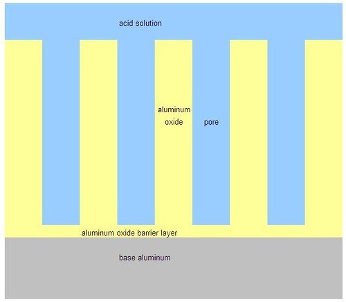 But if the process causes the anode to be covered with an effective insulating layer, how can it serve as an electrode? How can oxygen reach the aluminum to combine? The answer to these questions is in the structure of the anodize layer. The portion of the oxide layer immediately adjacent to the base aluminum is a barrier layer which is more or less uniform material but has various flaws and temporary openings (created by acid dissolution) that allow acid to reach the metal underneath. The thickness of this layer is 10 to 15 nm, or about 1.0 nm per volt of cell potential. The voltage drop in the cell is almost entirely across this barrier. The potential of the bulk of the acid solution is that of the cathode. This explains why the coating is uniformly thick; there is no concentration of electric field at corners. The rest of the coating (outside the barrier) is porous, with the pores oriented normal to the metal surface. The pores are created and maintained by acid dissolution. There are about 800 pores in a square area of 1 micrometer on a side, and these pores are about 15 nm diameter. Overall, the anodize layer resembles a honeycomb.