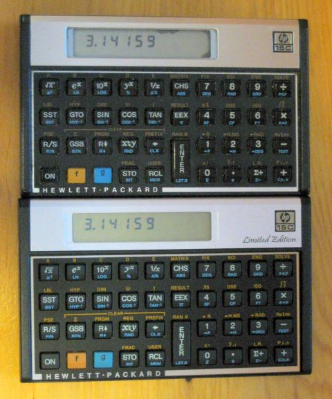 At the top in this picture is my old 15C, acquired about 1983. About 10 years ago the display suddenly developed some dark patches at the edges, but this has not yet affected calculator function. Below is the new “limited edition” 15C, temporarily available. I couldn’t resist, given the prospect of my old calculator some day failing.