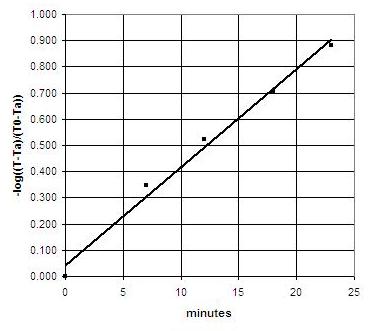 Here I have plotted a log function of the cell temperature in order to turn the exponential curve into a straight line. From this plot, I deduce that the heat removal capacity of the new cathode is 53 watts, for a ground water temperature of 54 deg F. In my new reel design, I need 2.44 amps to anodize the complete frame plus the spool hub. The heat to be removed is 43 watts.