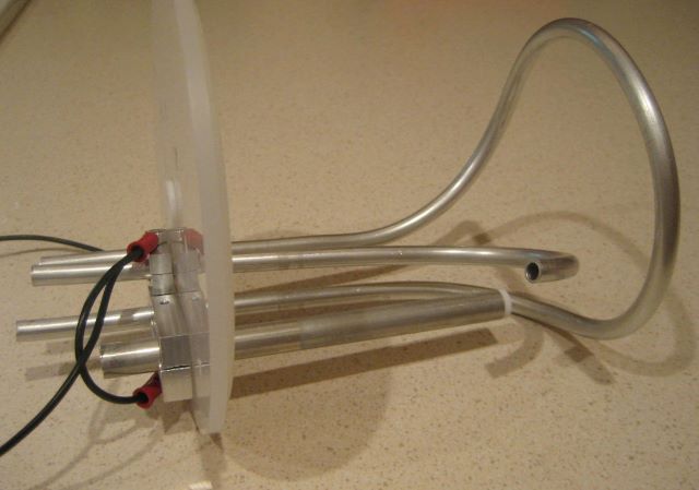 Here you see a cooling loop of 3003 tubing, a J shaped tube (also of 1/4 inch 3003 tube) for air bubbling, and a plugged straight tube (6061 aluminum) that is a well for a thermometer. These are electrically tied together to form the cathode. The total surface area of the cathode is much less than 16 square inches, but I learned from a reference book that anodizing cathodes are typically about one third the area of the anode. The 3003 tubing is soft enough to be easily bent by hand. Air bubbling keeps the electrolyte from becoming thermally stratified; air is provided by an aquarium pump.