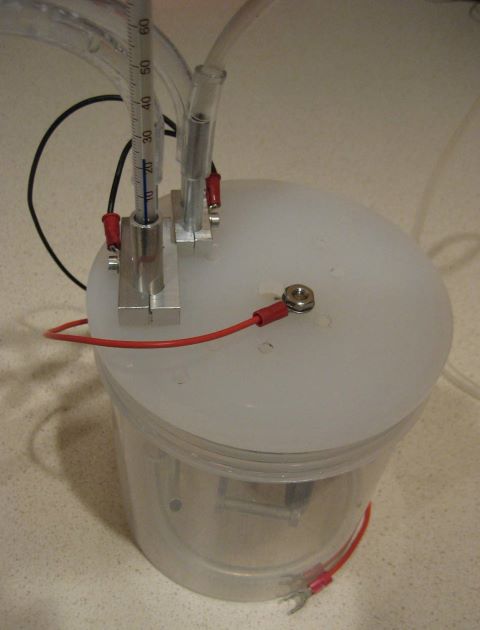 Here is the complete cell assembly (w/o electrolyte), with Tygon tubing for air, water supply, and water drain..