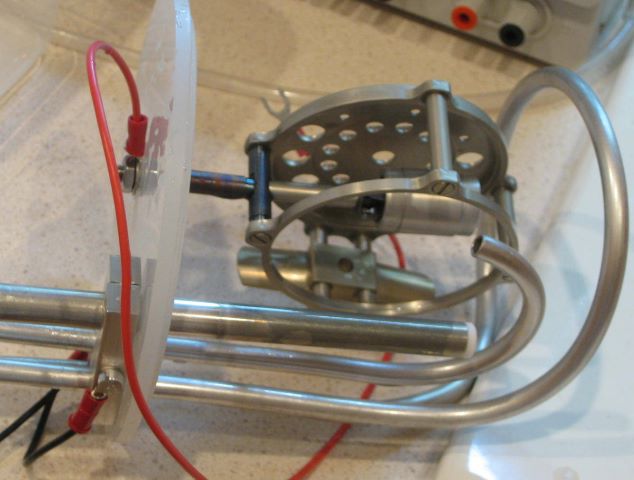 Here I have extracted the lid/electrode assembly after 1 hour. Note that the 6061 thermometer tube has a dark deposit (which can be wiped off) but the 3003 tubes, having less alloy metal content, stay bright.