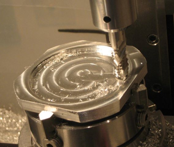 Step 19: Cut the main outer radius. I start with a roughing end mill and finish the last .010 inch with a standard end mill.