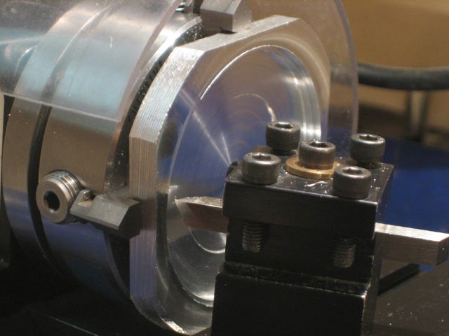 Because the chuck jaw step is higher than the flange thickness of the finished part, I have inserted a .040 thick spacer between the jaws and the part. This spacer is just a round piece of aluminum sheet. Cutting sheet metal is a problem. I cut an oversize circle with a scroll saw, then hold it in a chuck to drill 3 holes, then bolt it to a faceplate to turn the outer diameter.