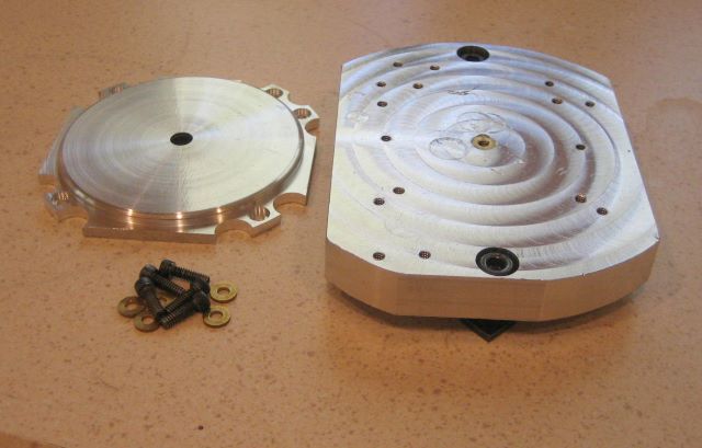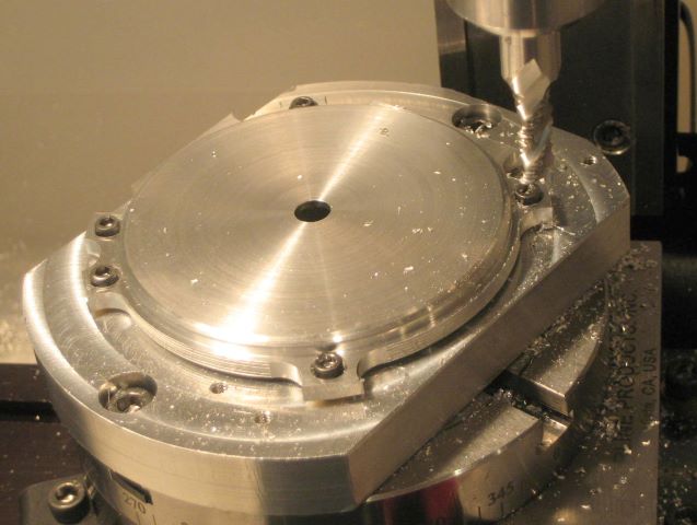 Step 18: Fasten to toolplate. We cannot finish while in the chuck; jaws stand in the way. This toolplate has a pin on the back that pilots into the rotary table.