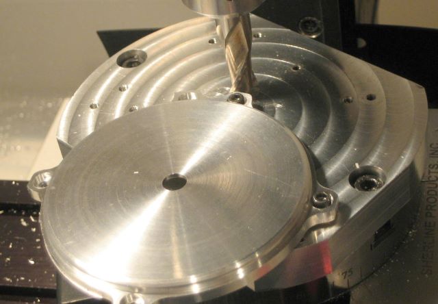 Step 15: Drill and counterbore the bolt circle. Angular position here is very critical. Remember that the rotary table has backlash, and take it out just as you would for the X and Y axes. The rotary table also has a locking setscrew; I had my table for some time before I found it.
