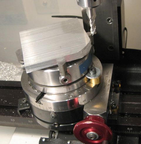 Step 16: Plunge mill the inner radii on each side of the lugs. Again, Angular posiiton is critical. I plunge a 1/4 inch roughing end mill before finishing with this 3/8 standard end mill.