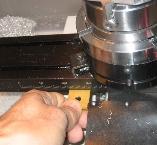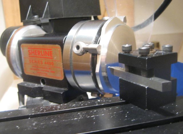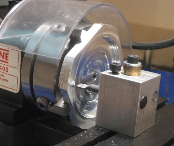 This 4 jaw chuck is a good milling vise, but only if it is restrained from angular motion (see bolt, washer, and brass spacer).