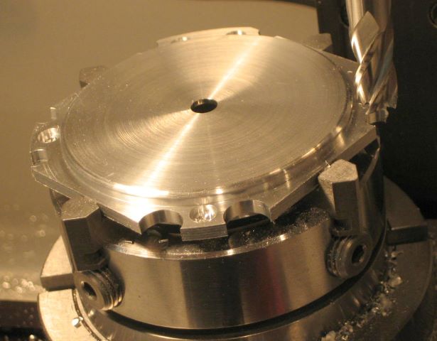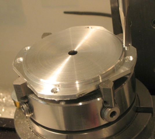 In re-chucking, you must not only re-center but also get the part down flat on the chuck jaws. Here you see a skin cut at the four corners. I can measure thickness at all corners to see if it is flat (i.e., parallel to the other side).