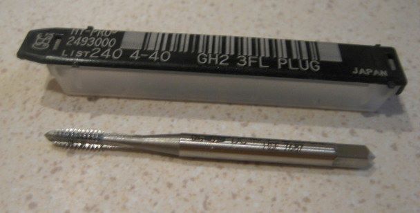 The threaded length on this 4-40 tap is just 0.3 inch; behind that is a reduced diameter shank so that a deeper hole may be tapped.