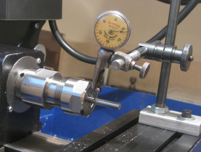 Certainly some of the fault lies in the manufacture of the collet holder. Here I am measuring .0055 inch TIR on just the tapered bore.